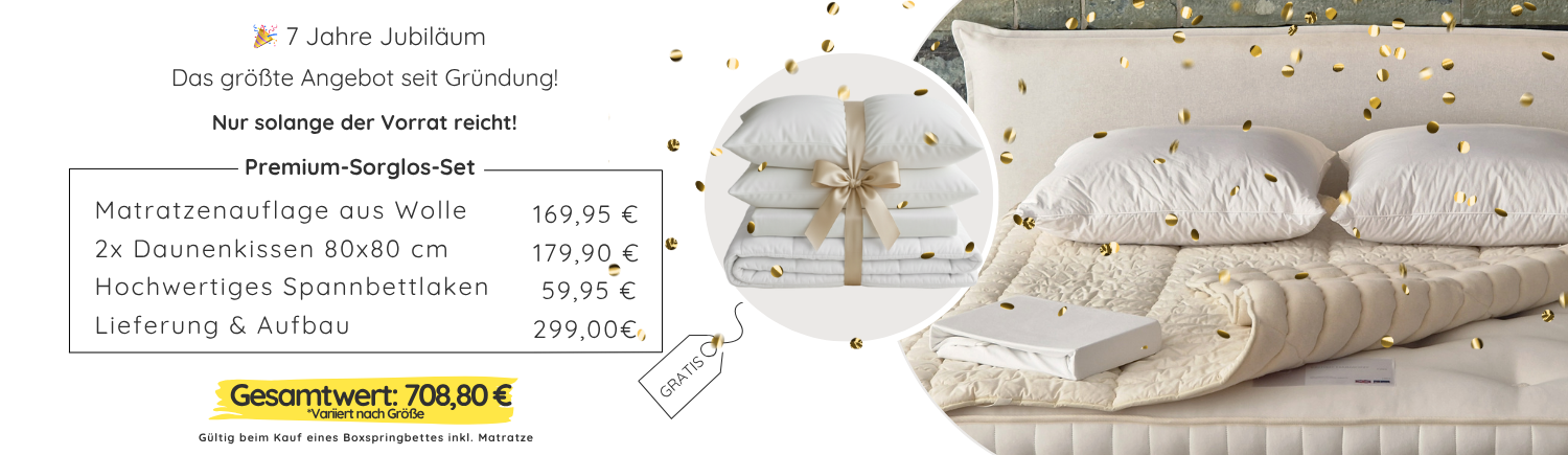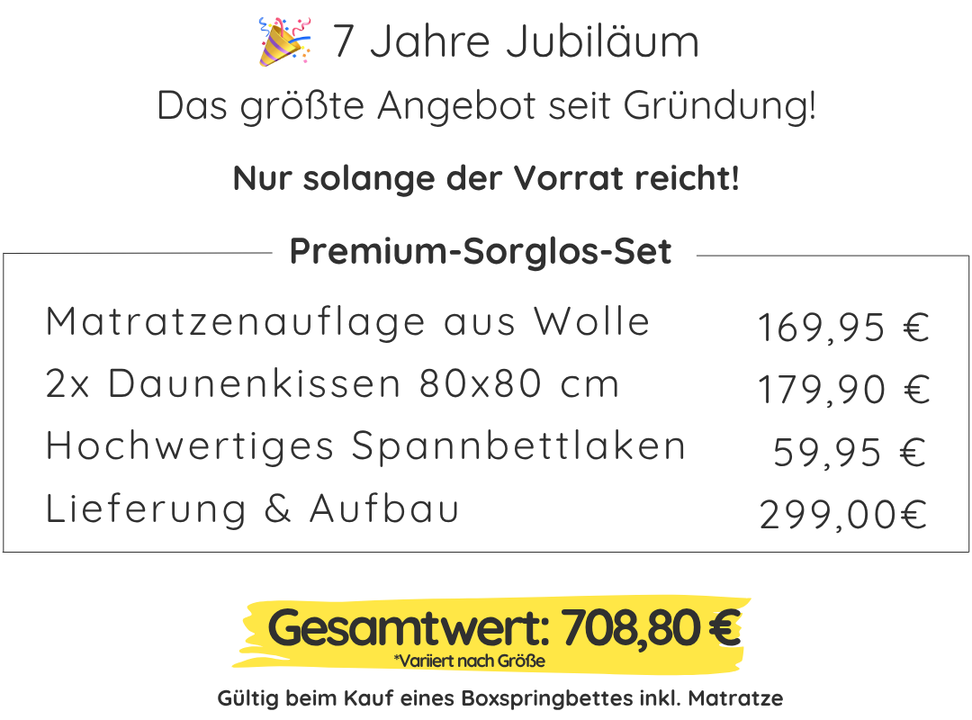 Wenn du eines unserer hochwertigen Boxspringbetten bestellst, genießt du erstklassige Luxus-Qualität und zusätzlich unseren kostenlosen Aufbauservice: Wir übernehmen nämlich nach deiner Bestellung den gesamten Prozess: Von der Herstellung Ihres exklusiven Boxspringbettes, der zeitnahen Lieferung in Ihre Räumlichkeiten bis hin zum schnellen, 30-minütigen Aufbau von unserem geschulten Fachpersonal – damit du dich entspannt zurücklehnen kannst.